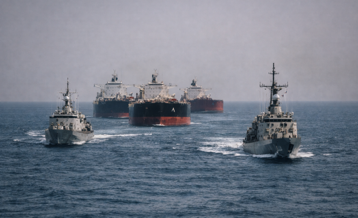 Visualize supertankers creeping single-file behind Arleigh Burke destroyers, DFC seals replacing Lloyd’s stamps.